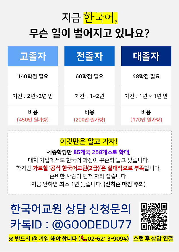 ⭐전 세계 한국어 수요 폭발 → 한국어교원 2급 준비생 모집 (선착순)⭐