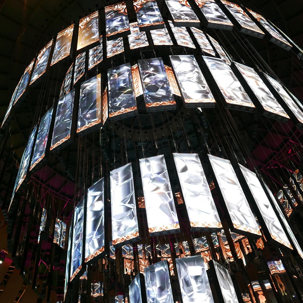 개별 구동장치가 설치된 총 156개의 디지털 LED 패널로 이루어진 대형 키네틱 샹들리에는 시시각각 변하는 샹들리에의 모양과 각각의 패널에서 연출되는 다양한 그래픽을 통해 다이내믹한 시각 경험을 선사합니다.