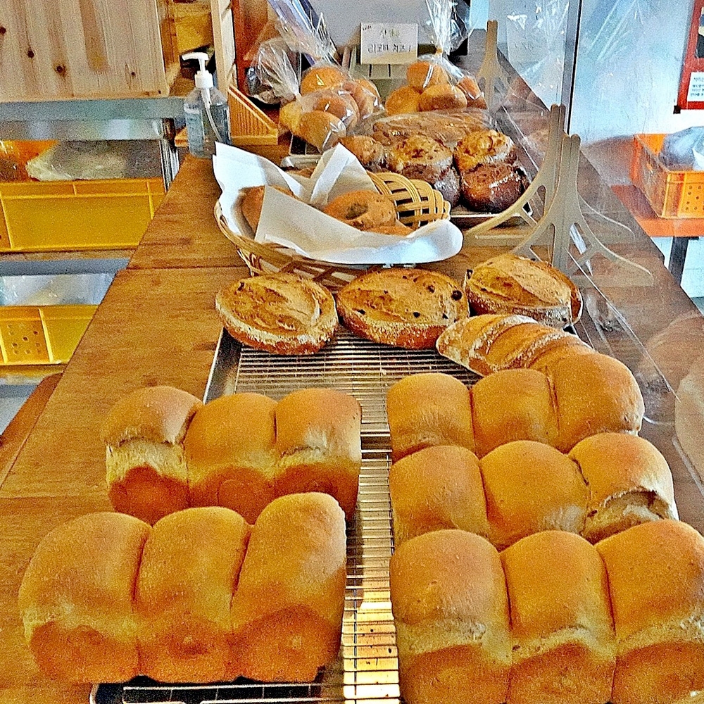 산내 버스 정류소 바로 옆에 착한 가게 느림보상점이 자리한다. 빵집으로 들어서기 전, 입구 옆의 상점 소개문구가 인상적이다. 지속가능한 빵집이자, 로컬푸드를 파는 가게이고, 제로웨이스트 소개소이기도 하다. 상점 한 벽면의 선반에는 동네에서 나는 농산물이나 인근 공방의 친환경 제품들을 전시해주고 판매대행을 해주기도 한다. 또 이곳은 폐기물 쓰레기를 만들지 않는 생활을 실천하는 ‘제로웨이스트(Zero Waste)를 추구해 플라스틱 사용을 지양한다. 생분해성 수지로 만든 봉투만을 사용한다. 느림보상점의 빵, 지리산 아래의 구례에서 키운 우리 밀을 100% 사용해 건강한 빵을 만든다. 반죽기를 사용하지 않고 무반죽으로 12시간 이상 저온에서 느리게 발효시켜 준비한 반죽으로 빵을 구워 낸다. 내어놓는 빵은 주로 식사용 빵들이라 담백하고 부담이 없다. 또 우유, 버터 등 동물성 재료가 들어가지 않아 채식주의자들도 먹을 수 있다. 이 빵집은 일주일에 화요일과 토요일 이틀만 문을 연다. 문을 여는 날도 6시간 정도만 오픈을 하고, 그마저도 그날 준비한 빵이 모두 팔리면 일찍 닫기도 하니 미리 전화를 하고 가는 편이 좋다.
