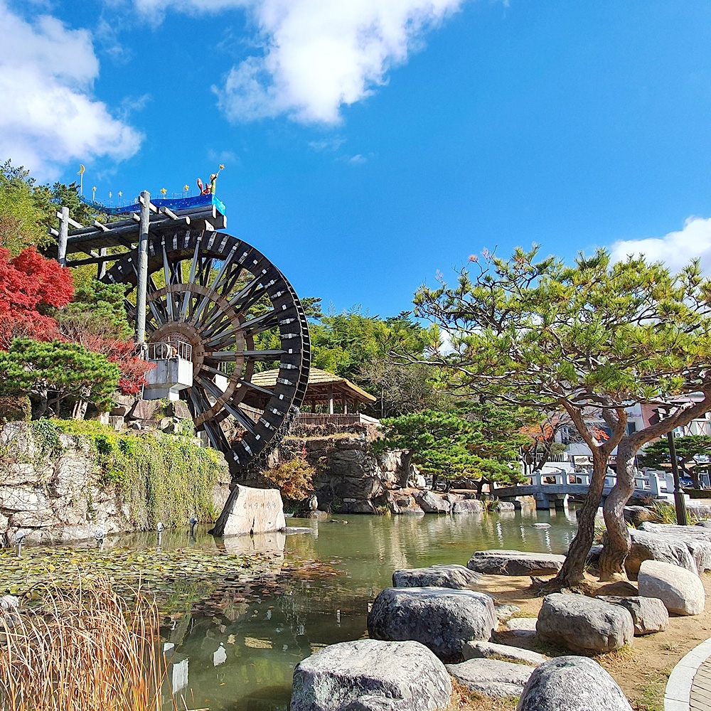 경북 경주시 보문단지, 봄이면 벚꽃의 만개로 상춘객들의 발길이 이어지는 곳이다. 힐튼호텔 맞은편에는 지름 13m의 커다란 물레방아가 돌고 있다. 덕동호에서 수로를 타고 흘러내리는 자연수압으로 돌아가고 있는데, 물레방아의 물받이가 108개로 백팔번뇌를 씻고 행복을 나누어 갖자는 뜻이라고 한다. 기념사진을 찍으며 즐거운 한때를 보내기에 좋은 곳으로, 근처에 경주 출신 문학가 박목월의 시비가 있다.