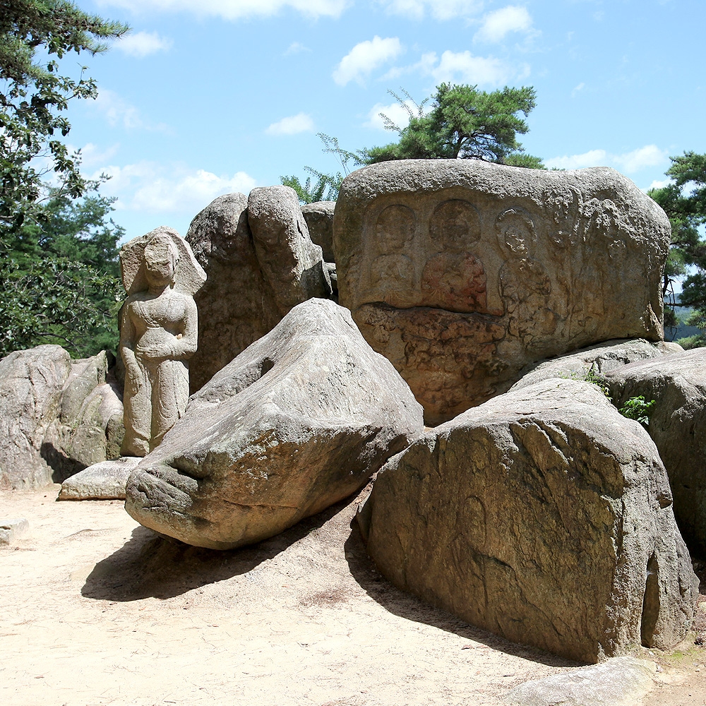 절 안쪽으로 들어가면 높이 9m, 둘레만 40m에 달하는 거대한 바위가 자리한다. 이 바위의 사면에 부처님의 세계가 표현되어 있다. 네 면을 끈기 있게 뜯어보길 바란다.