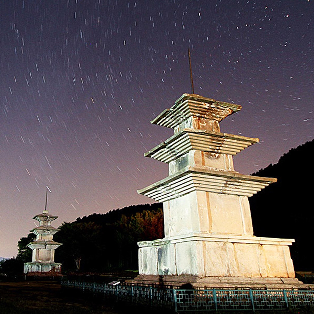 감은사는 신문왕이 아버지 문무왕을 위해 세운 절이다. 왜구의 침입을 막기 위한 호국사찰로 절을 짓기 시작한 문무왕이 1년 만에 세상을 떠나자, 아버지를 이어 신문왕이 완성했다. 건물지였던 금당터를 확인할 수 있고, 그 앞에 감은사지 동서삼층석탑이 위용을 뽐내며 서 있다. 아파트 3층 높이에 달하는 거대한 두 탑은 신라시대 1탑에서 통일신라시대로 넘어가면서 쌍탑을 이뤘던 가람배치의 전형을 보여 준다. 밤이면 동서삼층석탑이 경관조명으로 빛난다. 주변이 어두운 편이라 밤하늘과 석탑을 함께 담으려는 사진작가들이 많이 찾는다.