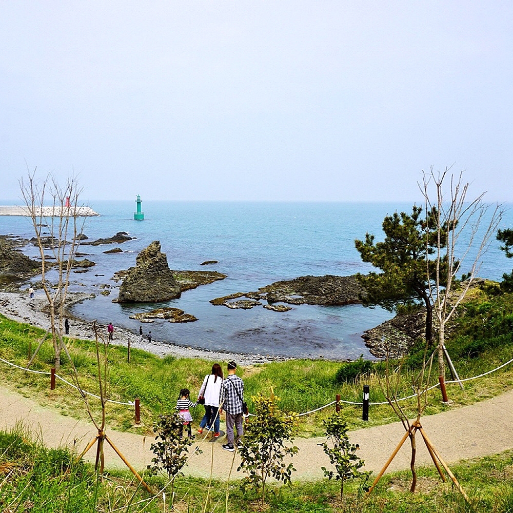 평탄한 해안 산책길이라 누구든 쉽게 걸을 수 있을 거예요. 주상절리는 물론 거대한 해안 암석 틈에 비죽 자라난 소나무처럼 자연의 힘을 오롯이 느낄 수 있는 ‘천연 건축물’을 감상하다 보면 시간 가는 줄 모르고요. 몽돌길을 지날 때는 작은 돌탑 위에 나의 소망도 올려보면 어떨까요.