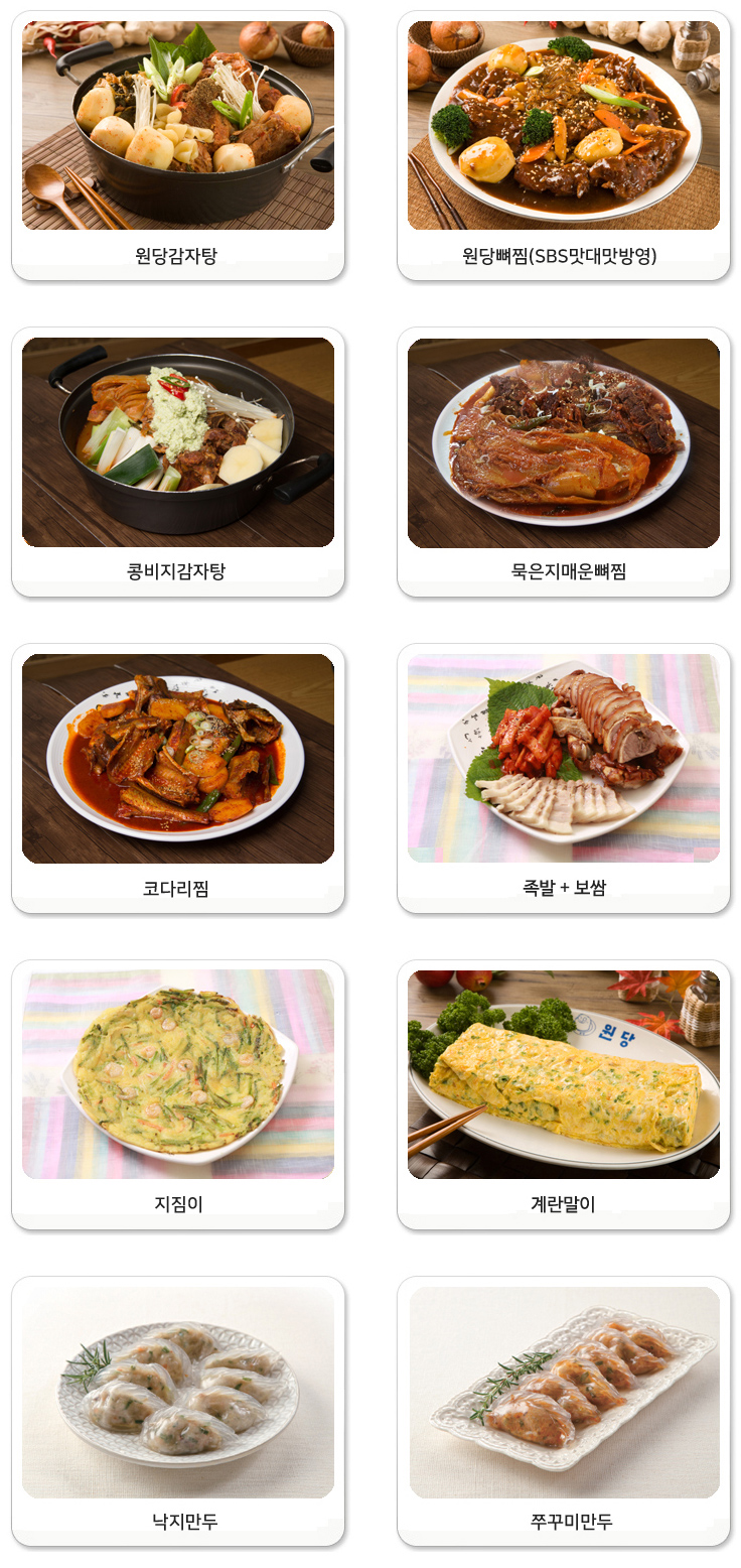 원당감자탕, 원당뼈찜, 콩비지감자탕, 묵은지매운뼈찜, 코다리찜, 족발+보쌈, 지짐이, 계란말이, 낙지만두, 쭈꾸미만두