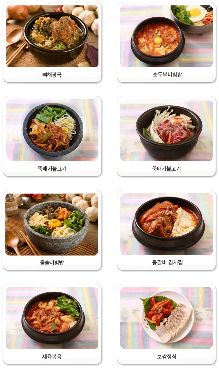 뼈해장국, 순두부비빔밥, 뚝배기불고기, 돌솥비빔밥, 등갈비김치찜, 제육볶음, 보쌈정식