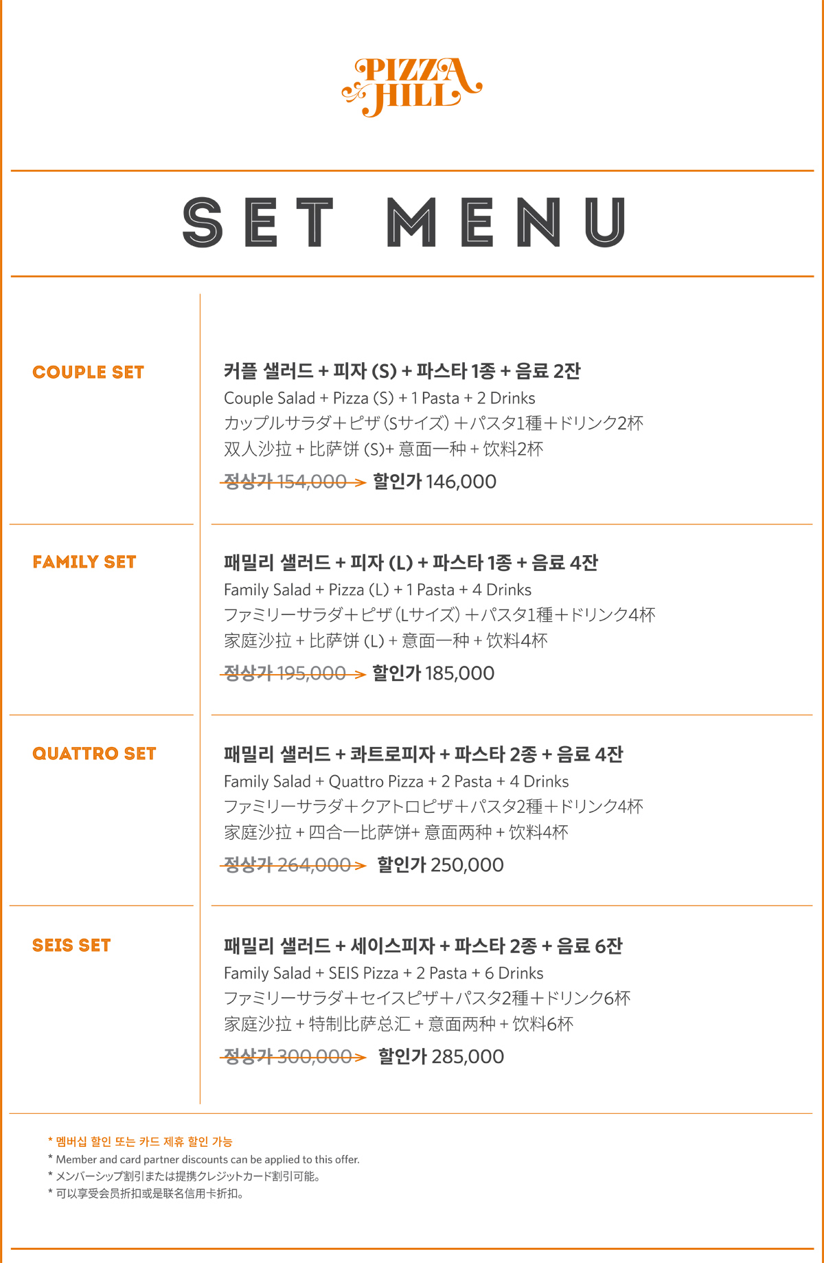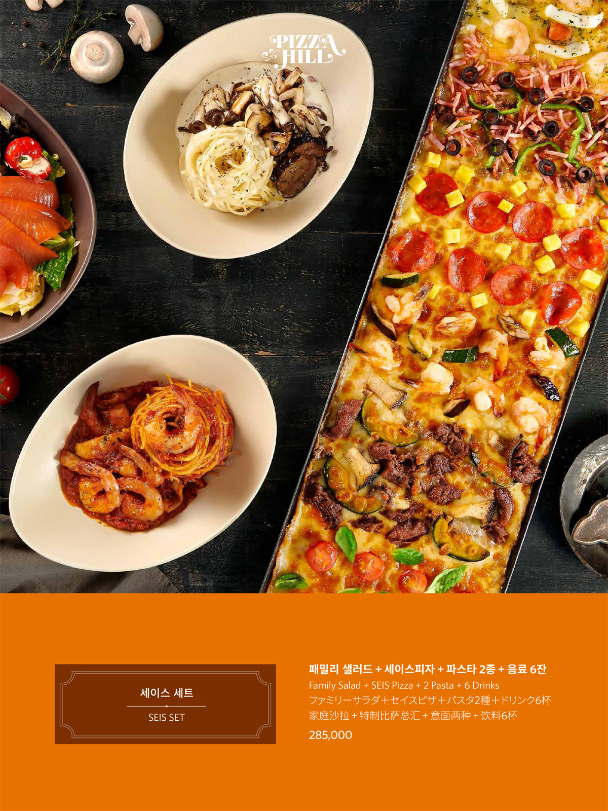 천연 치즈와 다양한 종류의 토핑이 듬뿍 올려져 있는 세이스 피자와 함께 피자힐의 모든 피자를 한번에 맛보세요.