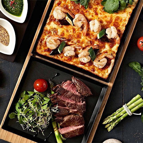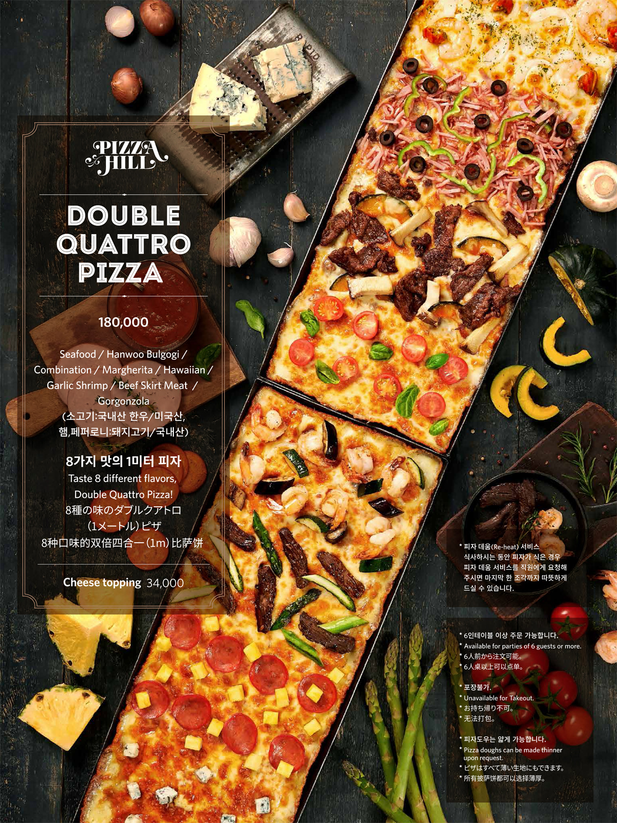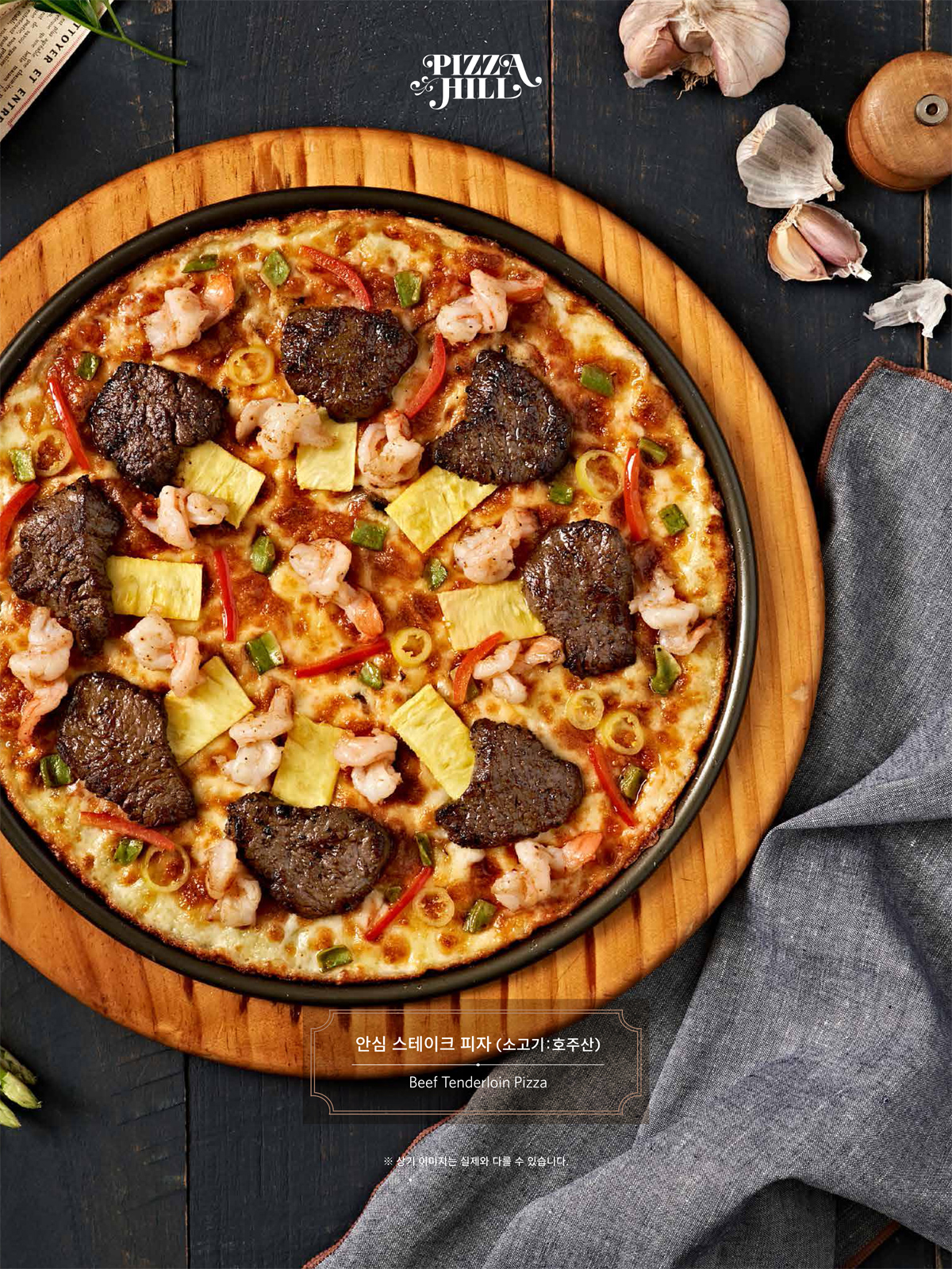 피자힐의 6가지 대표 피자인 콤비네이션 피자, 해산물 피자, 닭갈비 피자, 갈릭새우 피자, 마르게리타 피자 그리고 한우 불고기 피자가 한 판에 서빙되어 다양한 맛을 풍성하게 즐길 수 있습니다.