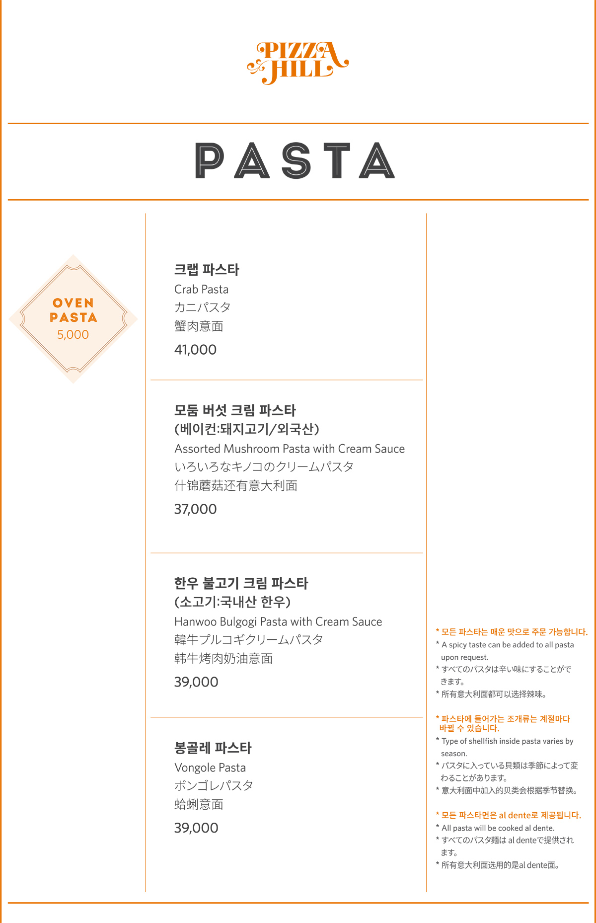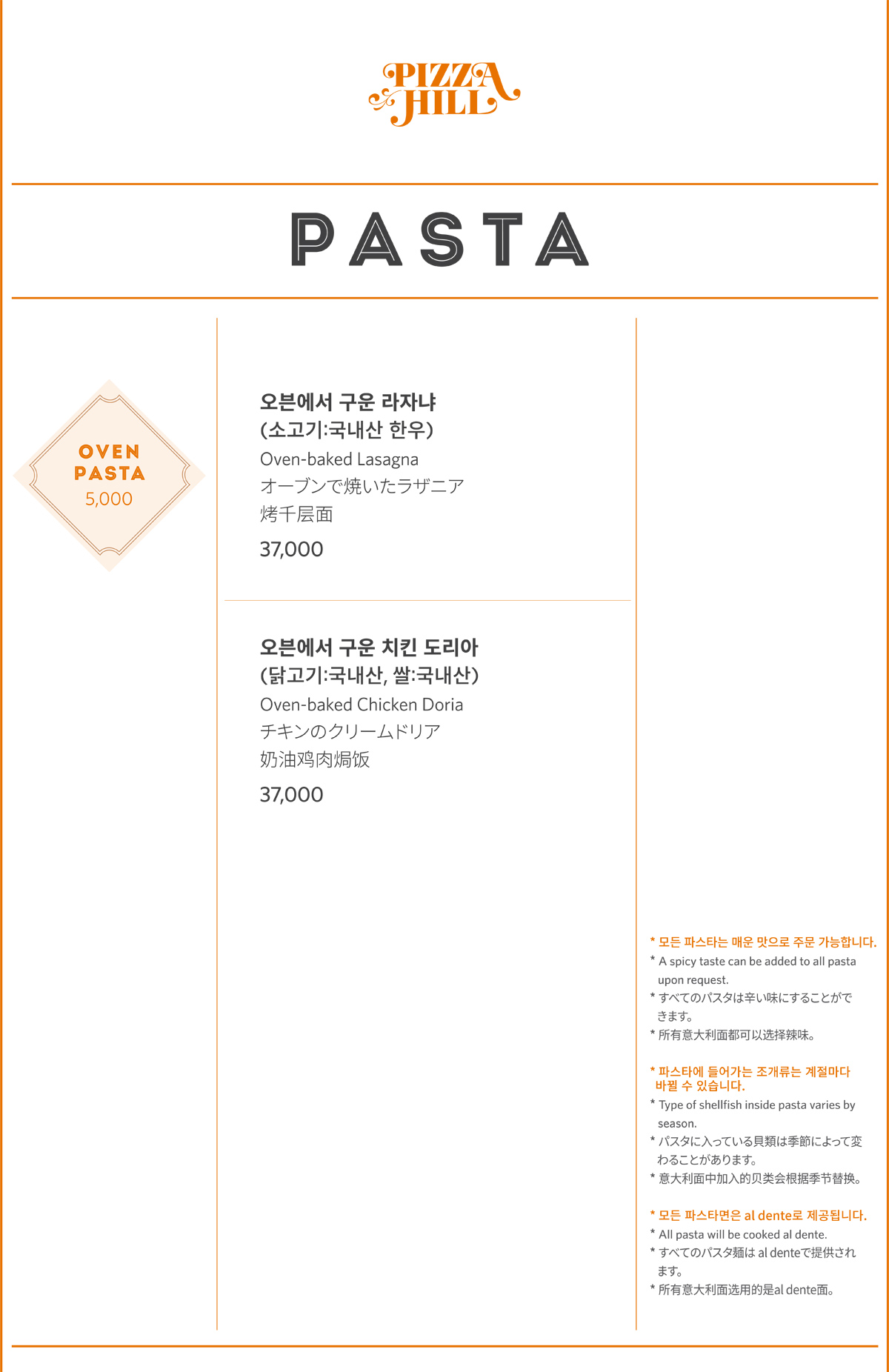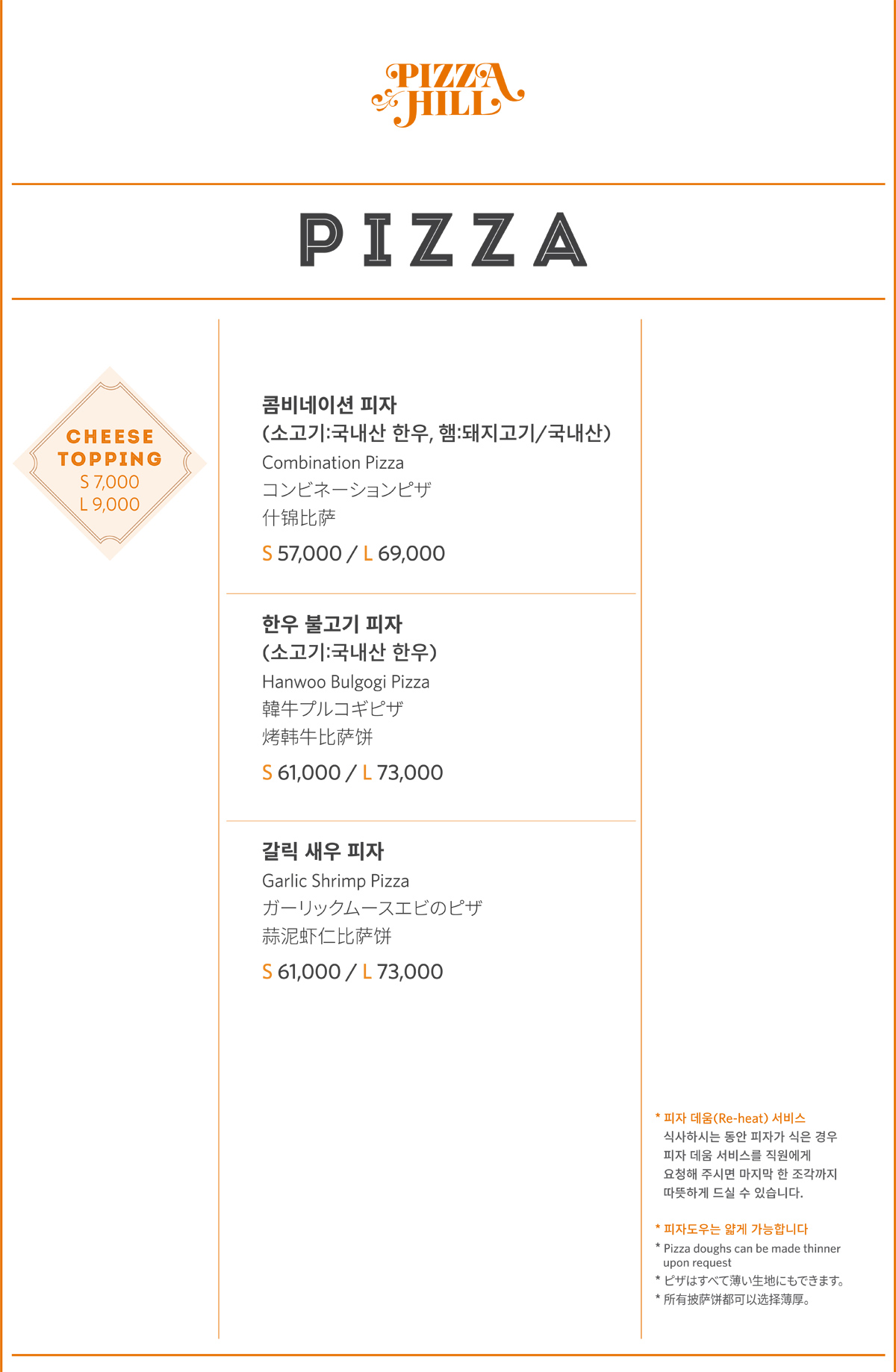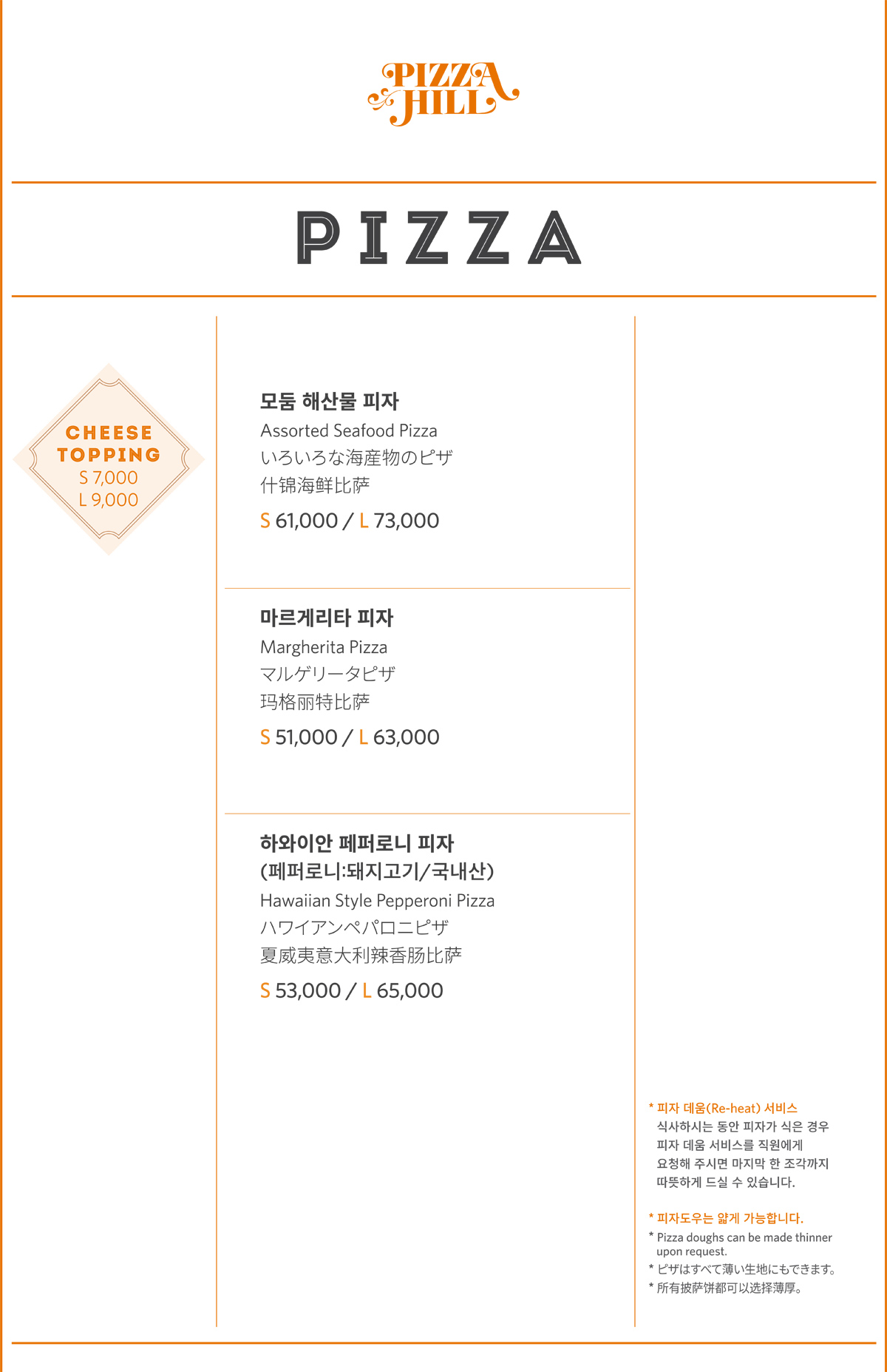 피자힐 도우와 파스타면에는 일체 계란이 첨가되어있지 않습니다. Pizza dough and pasta noodles both made without eggs.