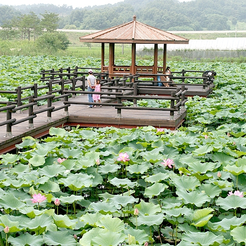 저수지 한 가운데 팔각정자를 설치해 연꽃에 둘러싸여 휴식을 취할 수 있다.