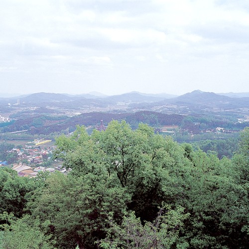 서쪽으로 드넓은 미호천 평야가 보이고, 남쪽으로는 은적산이 보인다.