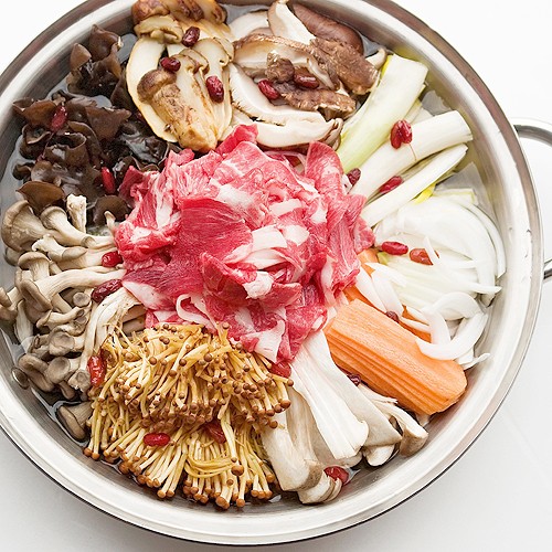우선 우수 혈통으로 선별된 한우에게 약초를 먹이고 사육한 봉화한약우를 팽이, 표고, 느타리, 양송이등 버섯과 함께 끓여내는 한약우전골은 기운을 북돋아 준다.