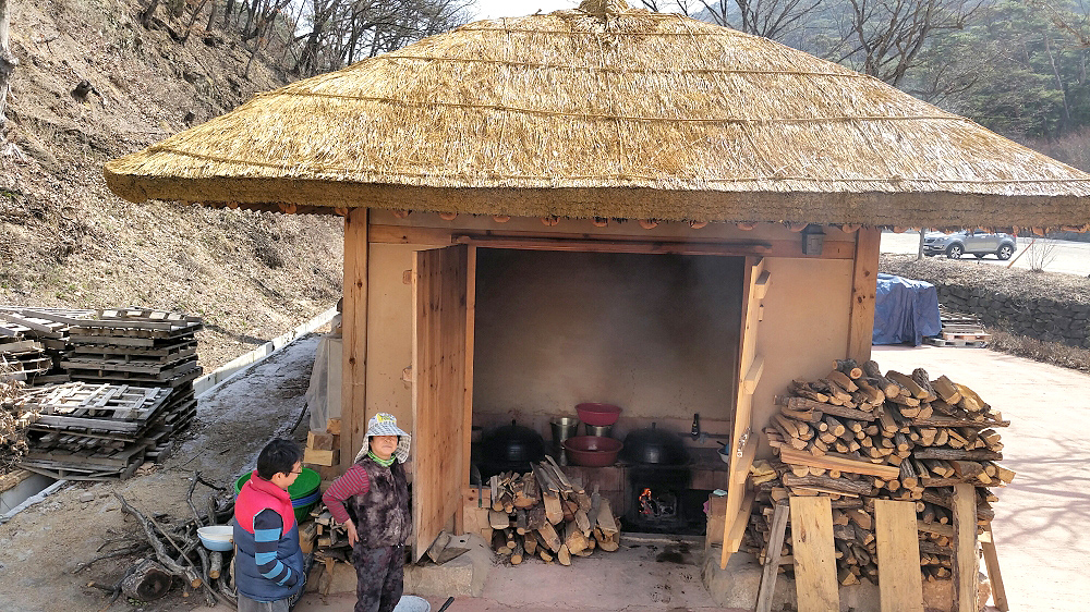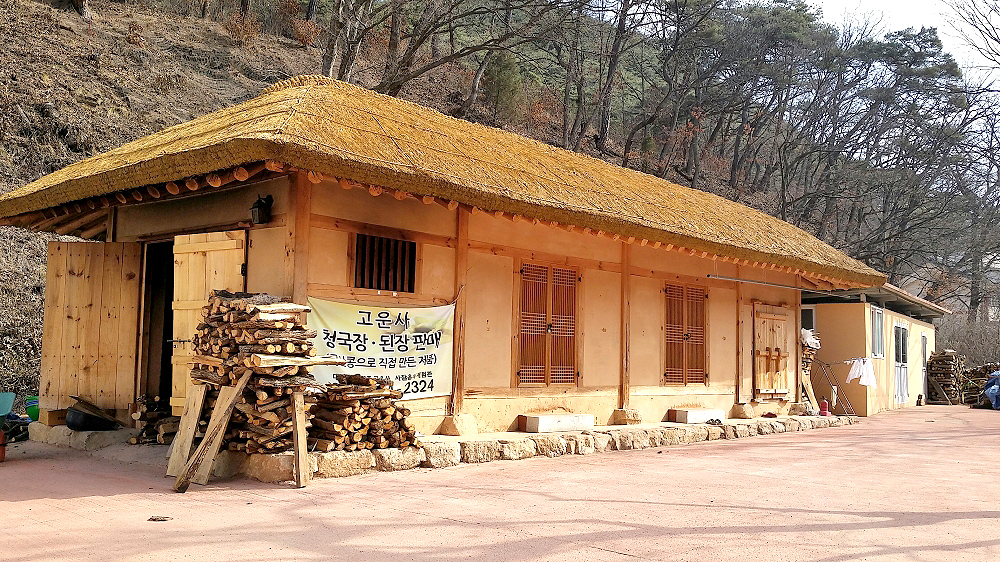 저희 사찰음식체험관에서는 콩으로 만든 식품과 콩을 이용한 발효식품 그리고 저장식품을 직접 만들고 있습니다. 아침이면 초가집 아궁이에 불을 지핍니다.