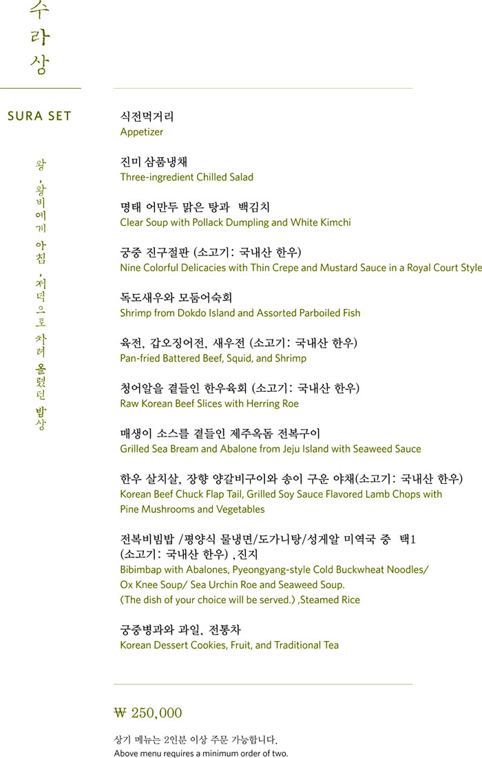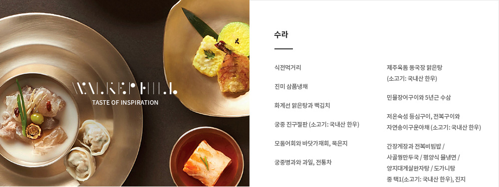 조선시대 사대부 요리와 궁중음식의 찬품단자(饌品單子 밥상 위에 오르는 음식들을 적은 목록)를 재해석해 선보이며, 팔도의 제철재료를 활용하고, 옛문헌의 고증을 바탕으로 장인의 손끝으로 완성한 워커힐 대표 한식당