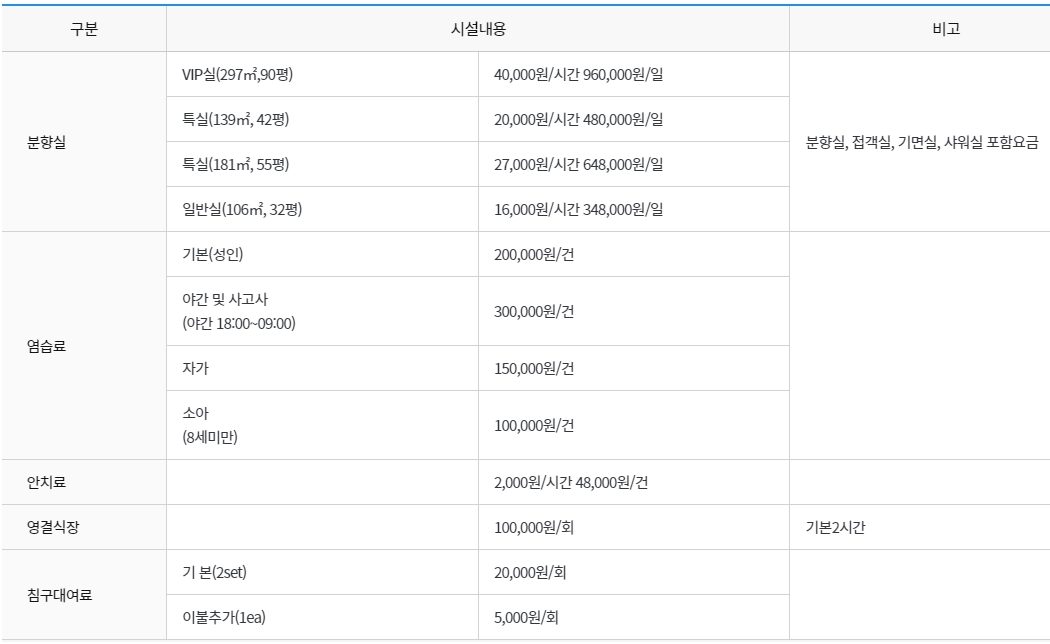 지하 2층 - 분향실 및 접객실, 영결식장, 안치실, 염습실/참관실, 휴게실, 야외발인장