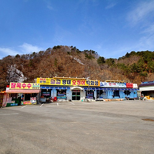 속초 → 미시령터널 → 용대삼거리 고가도로 지나 → 도로 상·하행선 사이 큰 소나무를 바라보면 → 우측으로 굴골황태덕장 직판장이 보입니다 → 직판장으로 우회전 → 굴골황태덕장