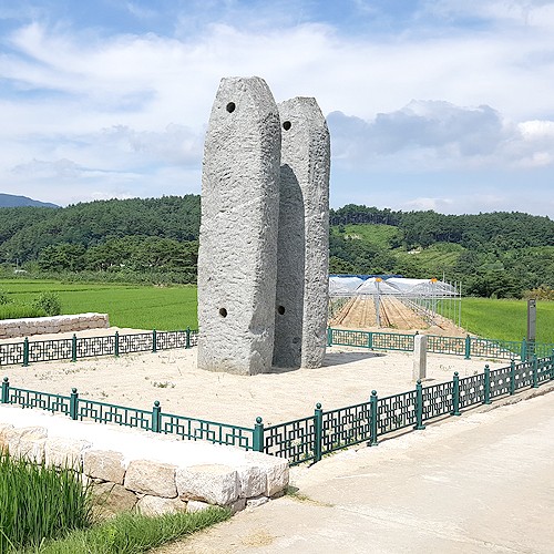 그리고 서로 마주 보는 내면과 외 측면이 수직을 이루며, 앞뒤 양면은 상부까지 수직이나, 위 끝에 이르면 머리 부분을 양측에서 점차 둥글게 깎아 곡선을 이루며, 정상은 뾰족하지만, 남쪽의 지주 첨단(尖端)이 약간 파손되었다.