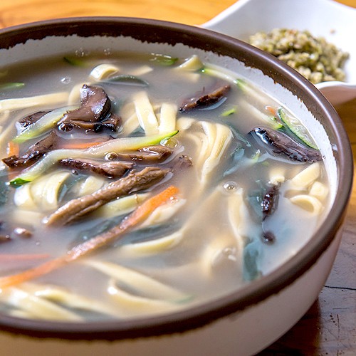 능이버섯 특유의 향이 걸쭉한 국물과 어우러지고 쫄깃한 면발이 풍미를 더하는 음식이다.