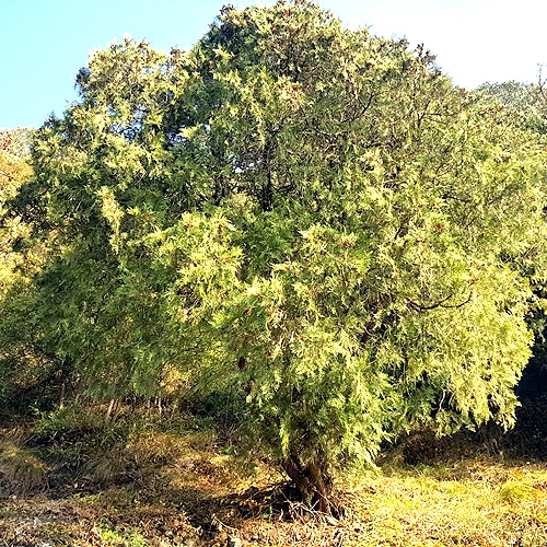 주로 절벽 바위틈에 뿌리를 내리고 숲을 이루는 경우가 많은데 매포읍 영천리, 그것도 평범한 길 위에서 만나는 측백나무의 무리는 왠지 모르게 더 반갑다.