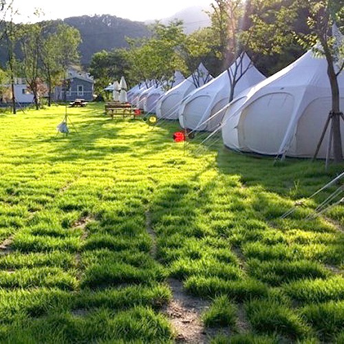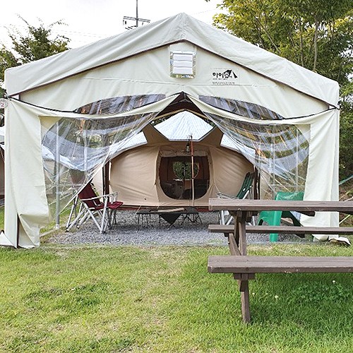 하이락에는 영국 로터스벨텐트(방염 면텐트)가 설치되어 있고 글램핑 텐트의 내부에는 퀸사이즈 침대가 구비되어 있다.