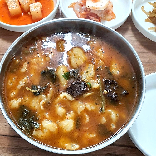 진한 한우사골육수에 자극적이지 않는 얼큰한 국물과 선지, 손수제비가 인기이다.