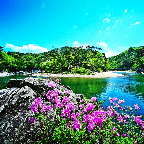 오랜 세월에 걸쳐 자연이 빚어낸 아름답고 강건한 바위들 사이로 시원한 물살이 기세 좋게 흘러내리고, 일렁이는 바람결을 따라 산벚꽃 이파리들이 점점이 흩날리며 떨어진다.