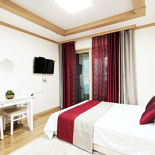 구비시설 : TV,침대,에어컨,쇼파,옷걸이,냉장고,전기포트,테이블,전자레인지,취사도구,욕실용품,객실샤워실