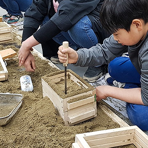 막대로 모래를 더욱 단단하게 치댄다. 이 때 사각틀이 움직이지 않도록 주의한다.